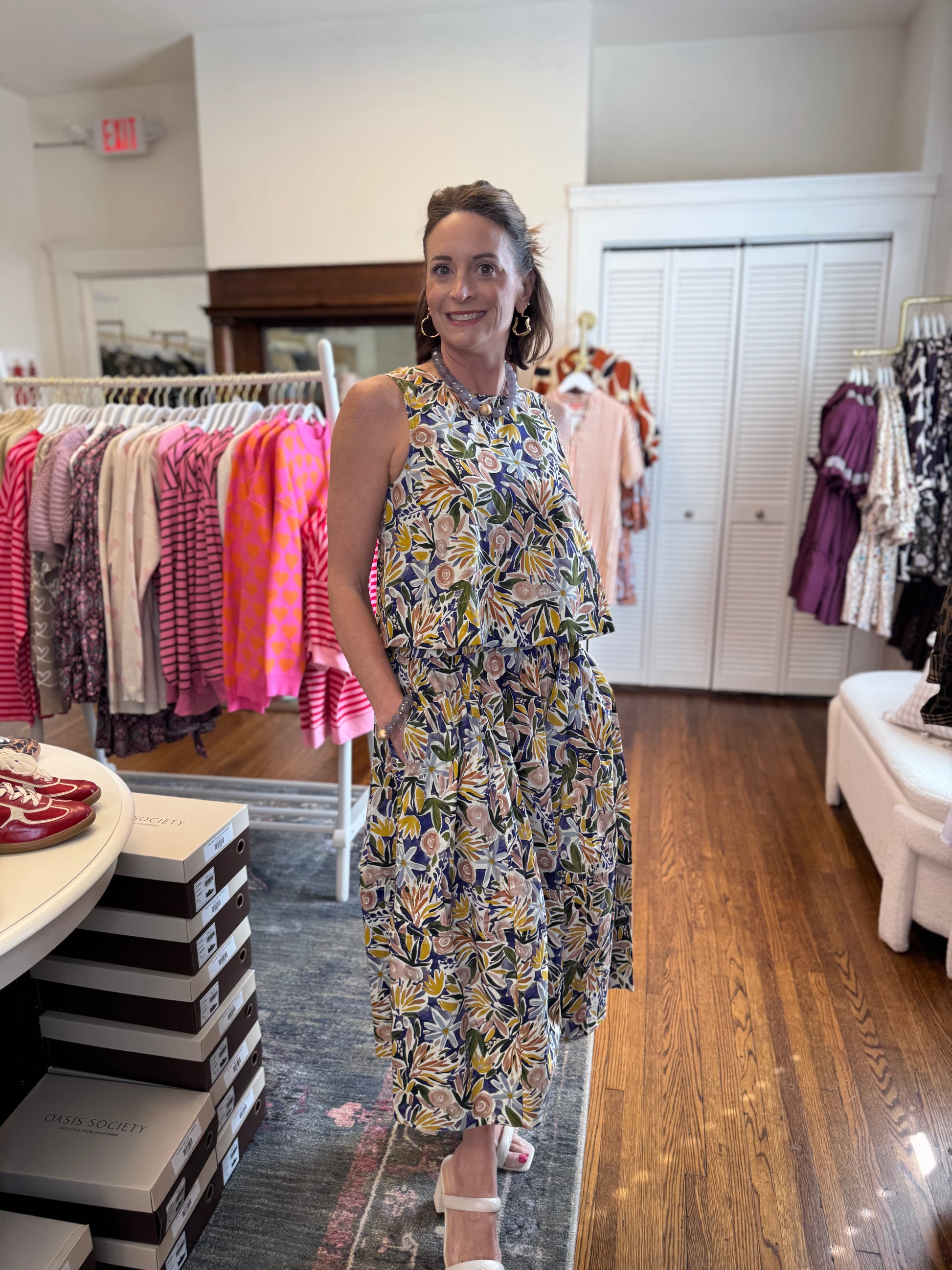 Elevate your wardrobe with the Abbey Floral Sleeveless Top, a vibrant statement piece featuring a stunning blend of green, purple, blue, and yellow hues. The timeless sleeveless silhouette offers effortless versatility—dress it up for special occasions or keep it casual for everyday wear. The intricate floral pattern brings natural beauty and movement to your look. Pair it with the matching skirt (sold separately) to create a coordinated ensemble that turns heads. Perfect for those who dare to make a bold, colorful impression. Allison is 5'5" in a small.