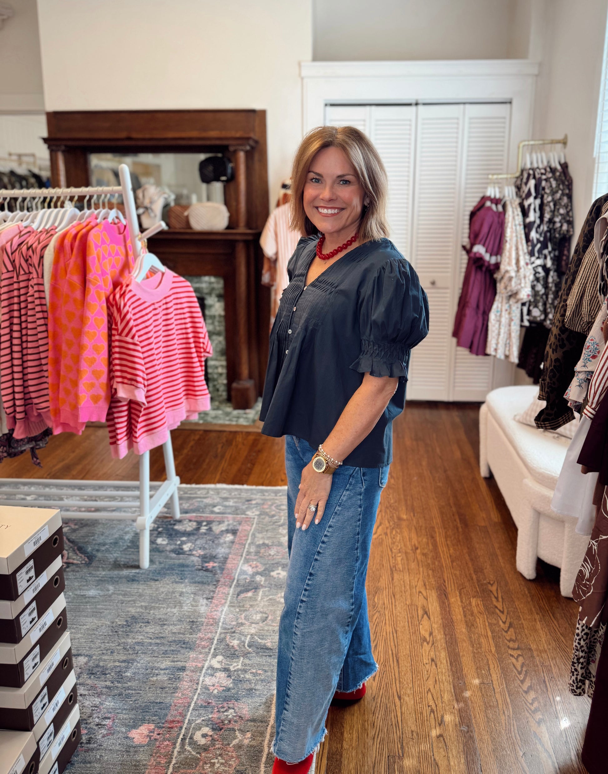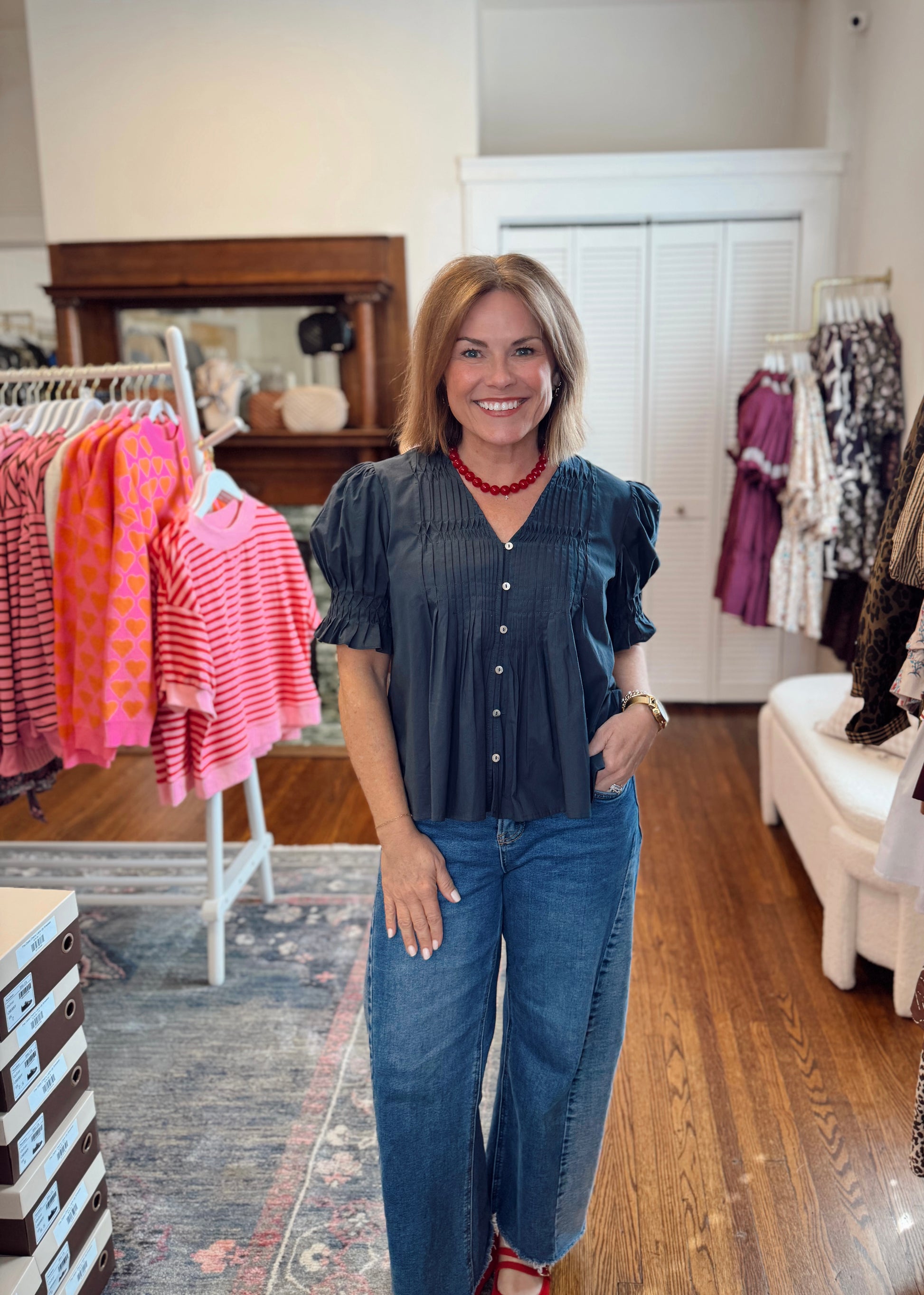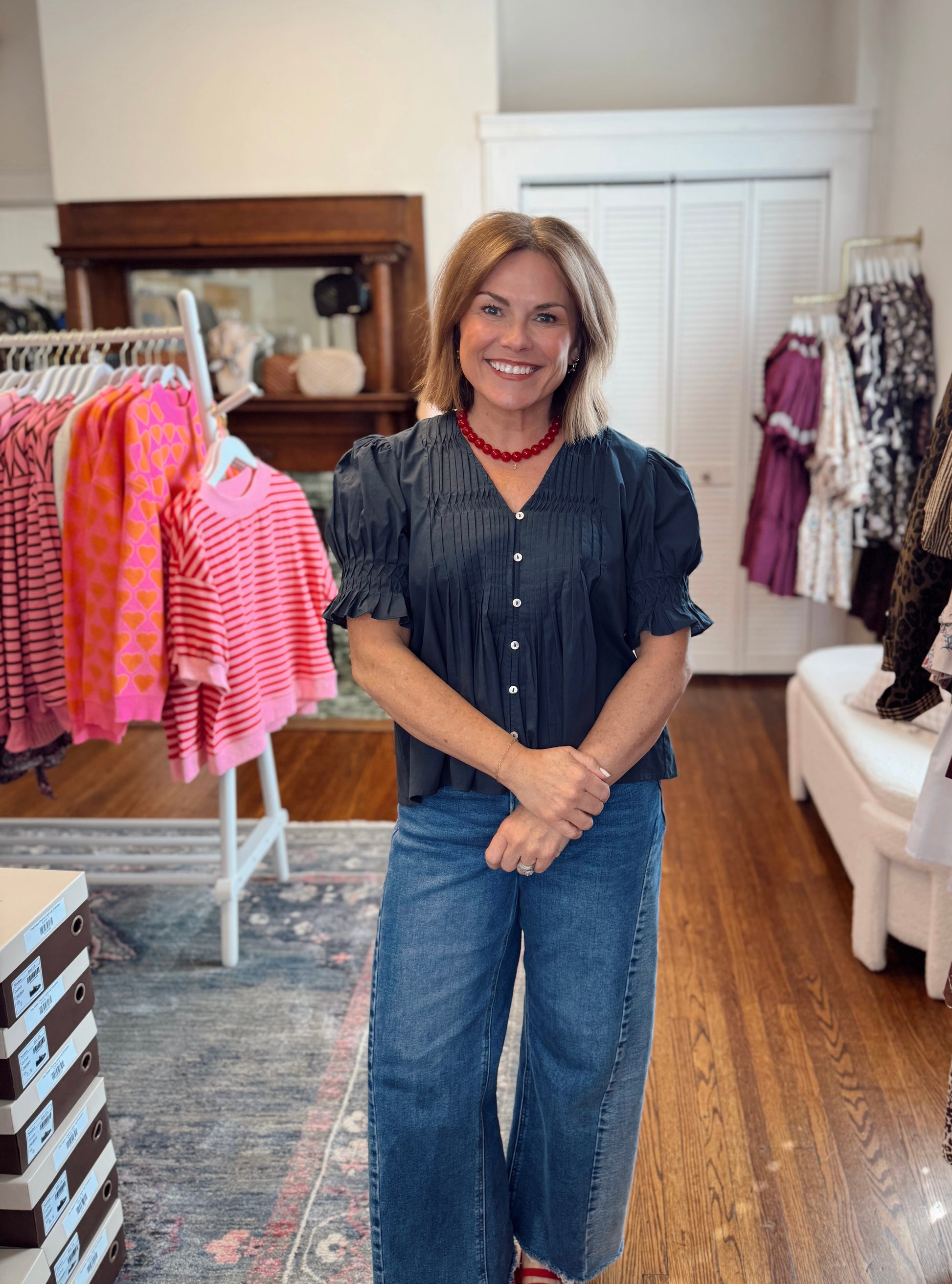 Update your everyday wardrobe with the Aimee Navy Tucked Detail Top, a sophisticated piece that effortlessly transitions from office to weekend. The flattering v-neckline and voluminous pleated puff sleeves create an instantly polished silhouette, while the button-down front offers versatile styling options. Crafted in a timeless navy hue, this top pairs beautifully with tailored trousers, denim, or skirts for a look that commands attention. Perfect for anyone seeking refined elegance with modern flair. Stephanie is 5'0" in a small.