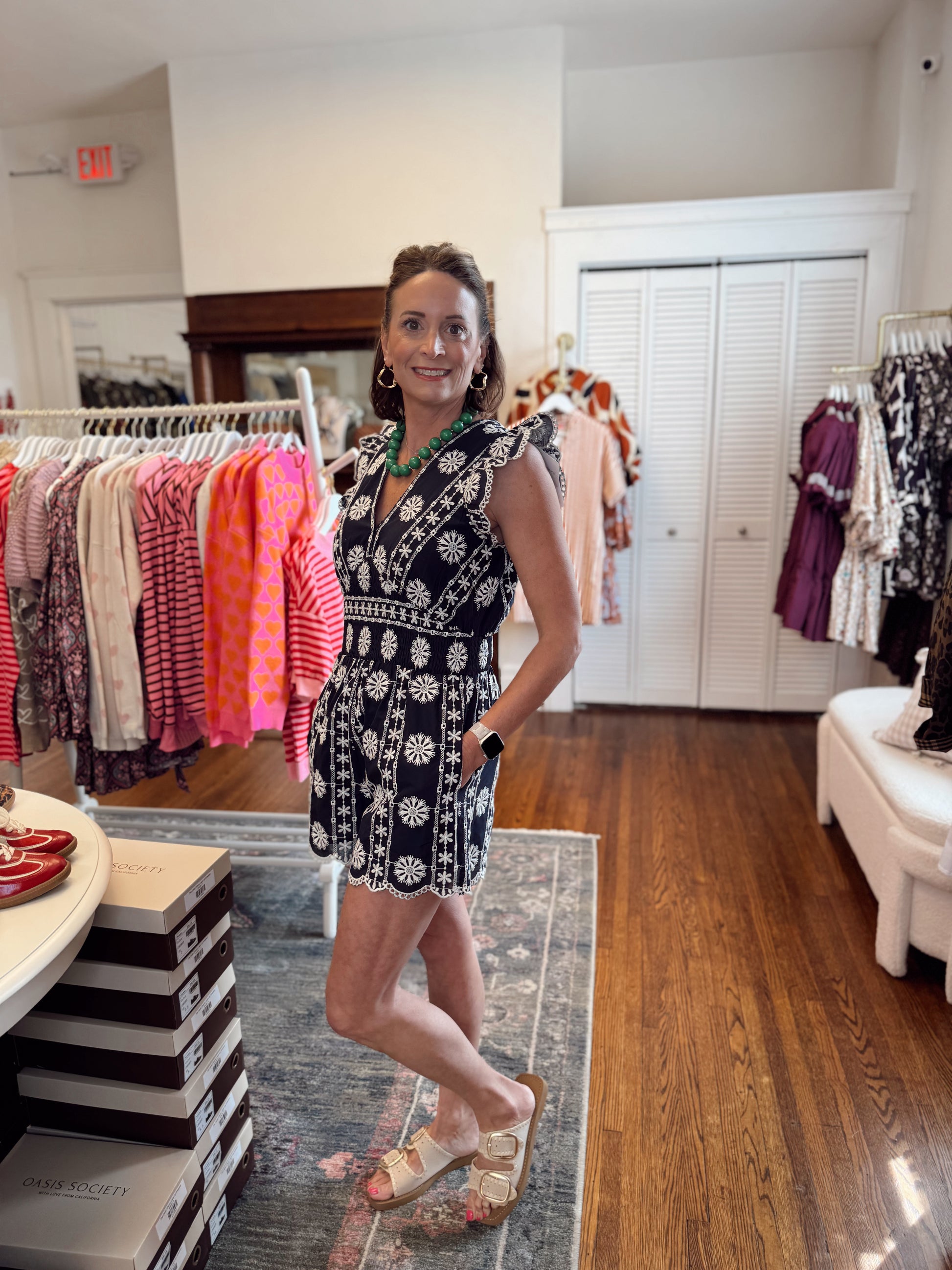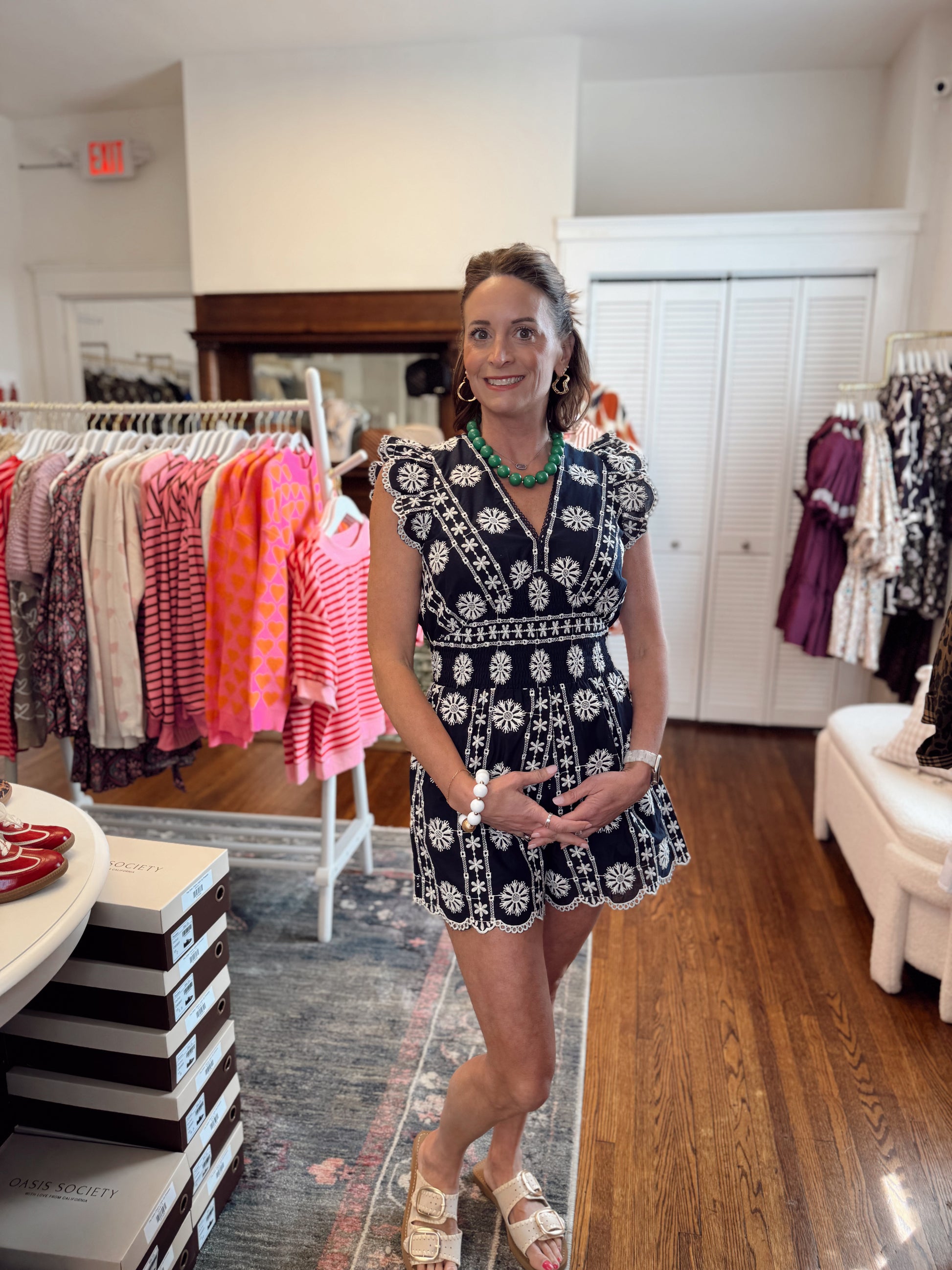 Elevate your spring wardrobe with this navy romper, featuring delicate white eyelet embroidery that adds timeless sophistication to every wear. The comfortable elastic waist ensures an effortless fit that moves with you throughout the day, making it perfect for everything from weekend brunches to evening outings. This versatile piece transitions seamlessly from season to season, offering both style and comfort in one chic silhouette. Allison is 5'5" in a small.