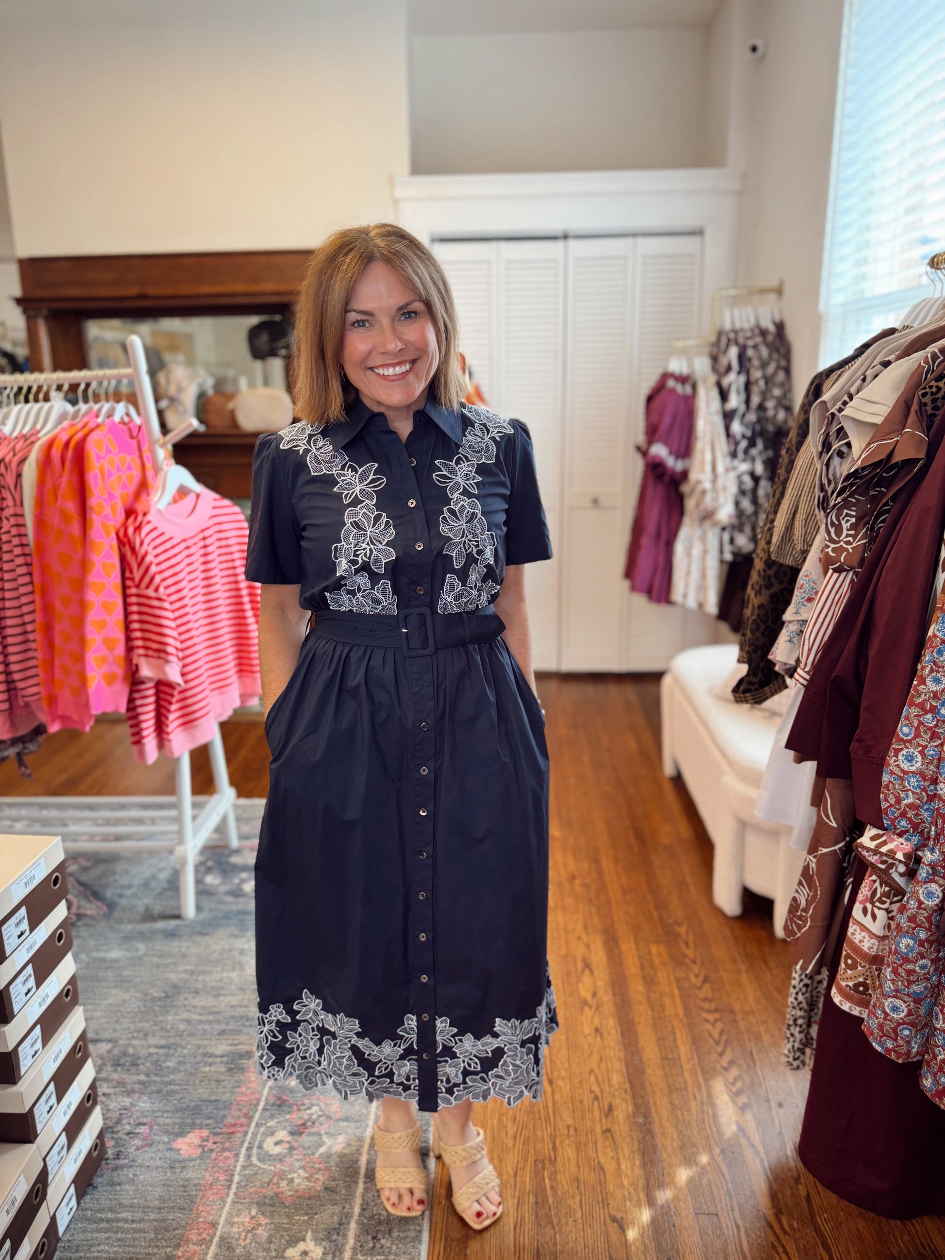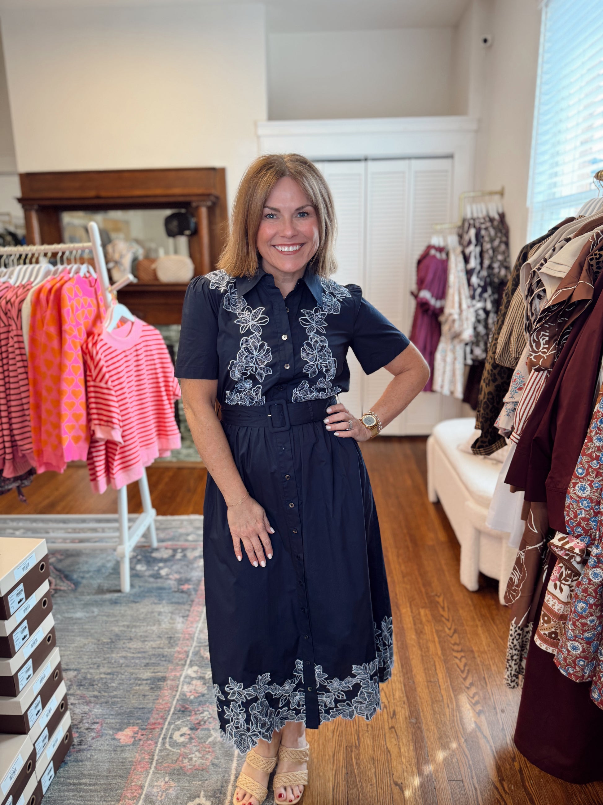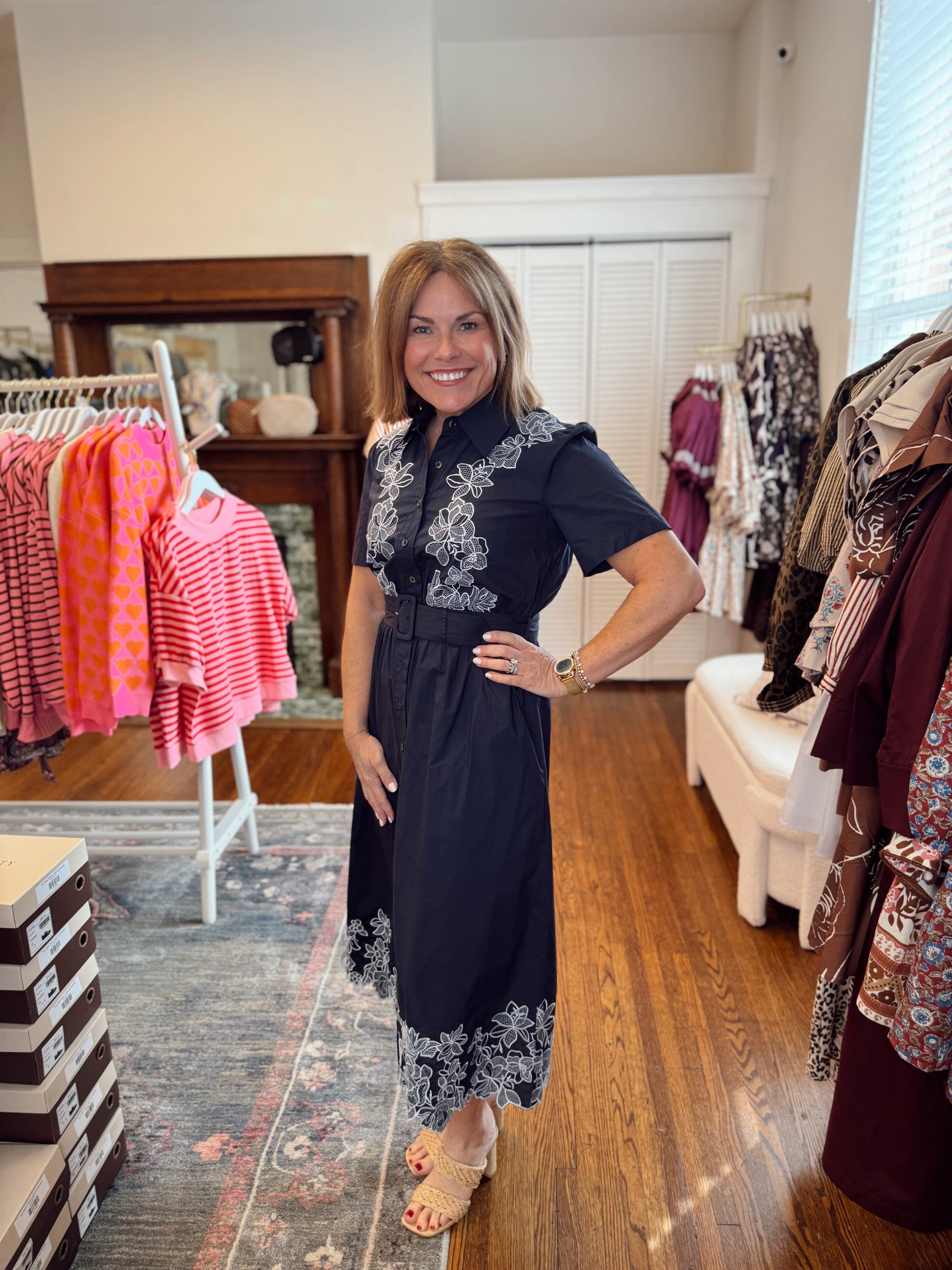 Elevate your wardrobe with the Ava Navy Maxi Dress, a timeless piece that seamlessly transitions from day to night. This sophisticated button-down style features a flattering belted silhouette that defines your shape, while delicate white embroidery adorns the chest and hemline for an added touch of elegance. The classic navy hue pairs effortlessly with any accessory, making it a versatile staple for any occasion. Whether you're dressing up for a special event or keeping it casual, this dress delivers polished style with understated charm. Stephanie is 5'0" in a small.