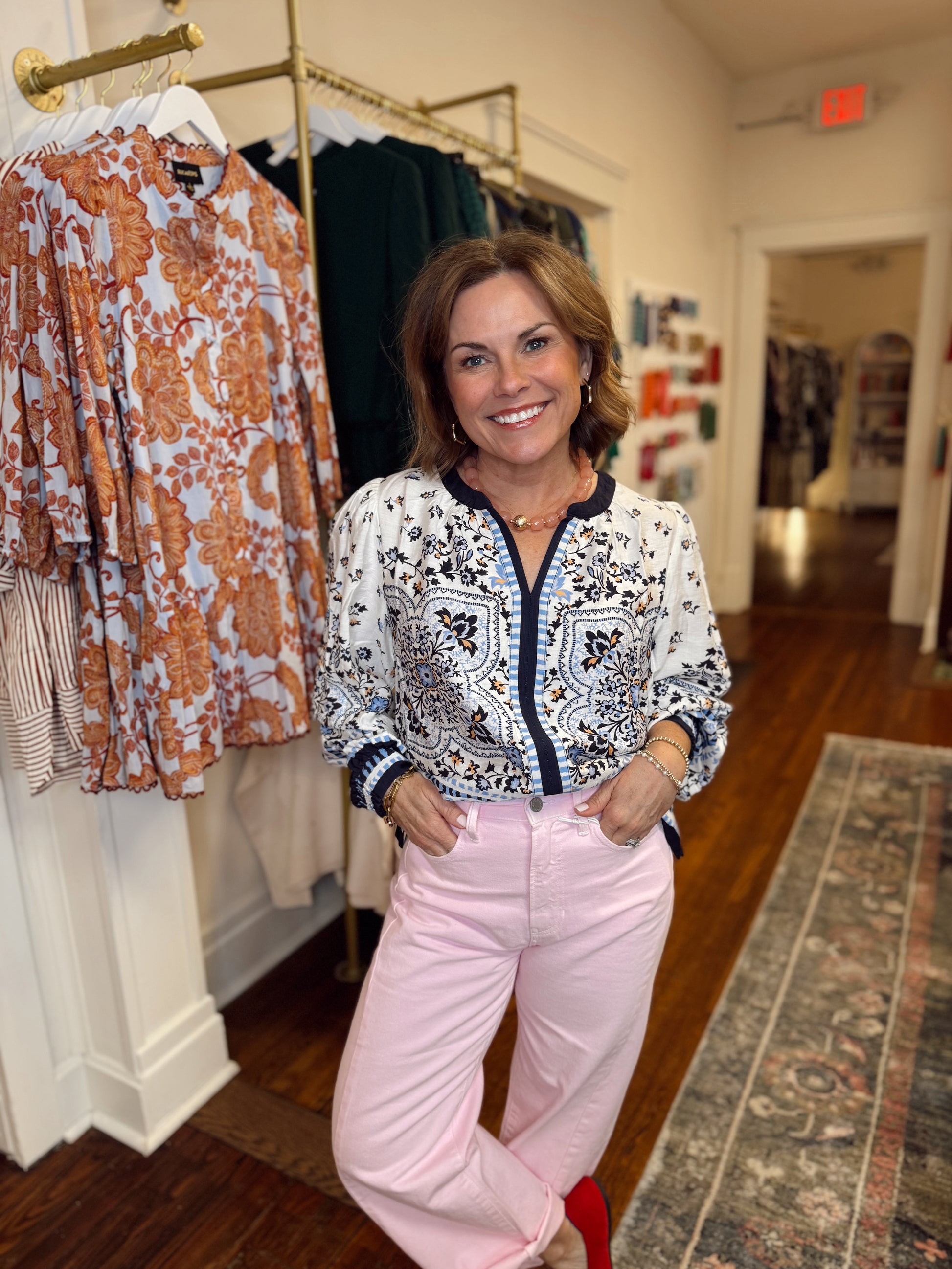 Elevate your everyday wardrobe with this charming floral top, featuring a crisp white base adorned with navy and light yellow blooms. The flattering V-neckline draws the eye upward while the navy detail down the front offers effortless styling versatility—dress it up with tailored trousers or keep it casual with your favorite denim. Perfect for layering or wearing solo, this piece transitions seamlessly from office to weekend, adding a fresh pop of color and personality to any outfit. Stephanie is 5'0" in a small.