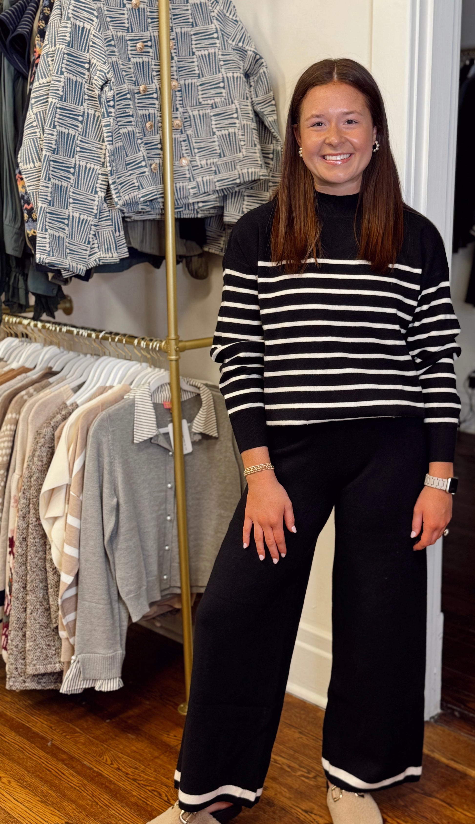 Elevate your wardrobe with this striking black knit top featuring crisp white stripes—a timeless pattern that works effortlessly from day to night. The soft, breathable knit fabric offers comfort without compromise, while the classic color combination pairs seamlessly with any outfit. Better yet, coordinate it with the matching pants to create a polished, put-together look that makes a statement. Whether you're dressing up for an occasion or keeping it casual, this versatile piece delivers style and sophistication in one. Taylor is 5'3" in a small.