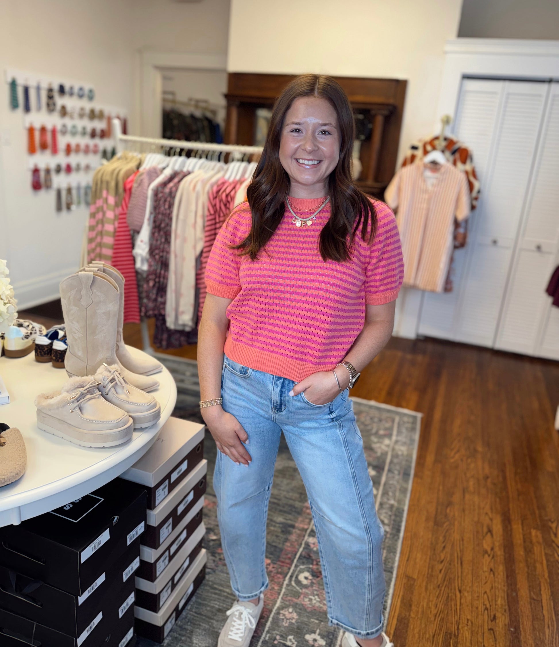 Effortless style meets comfort in this lightweight short sleeve sweater, featuring bold coral and pink stripes that instantly elevate any casual wardrobe. Perfect for layering or wearing solo, the breathable fabric keeps you cool while the eye-catching color combination makes a confident statement. Ideal for spring transitions and summer evenings, this versatile piece pairs seamlessly with denim, skirts, or tailored pants for endless outfit possibilities. Taylor is 5'3" in a small.