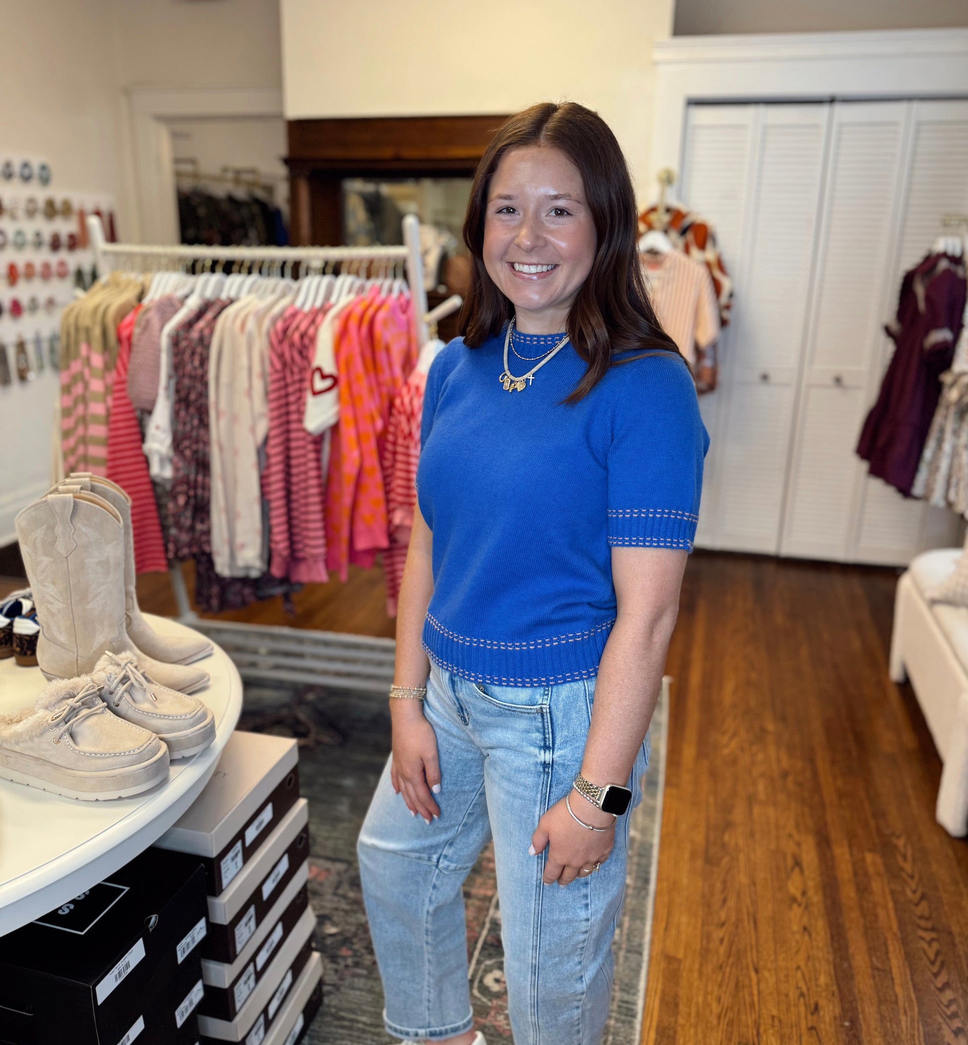 Elevate your everyday wardrobe with this striking cobalt blue short sleeve sweater. The rich, jewel-toned hue commands attention while the contrast stitching adds sophisticated detail and visual interest. Perfect for layering or wearing solo, this versatile piece transitions seamlessly from casual weekends to polished office settings. The structured fit flatters all silhouettes, making it an essential addition to any style-conscious closet. Taylor is 5'3" in a small.