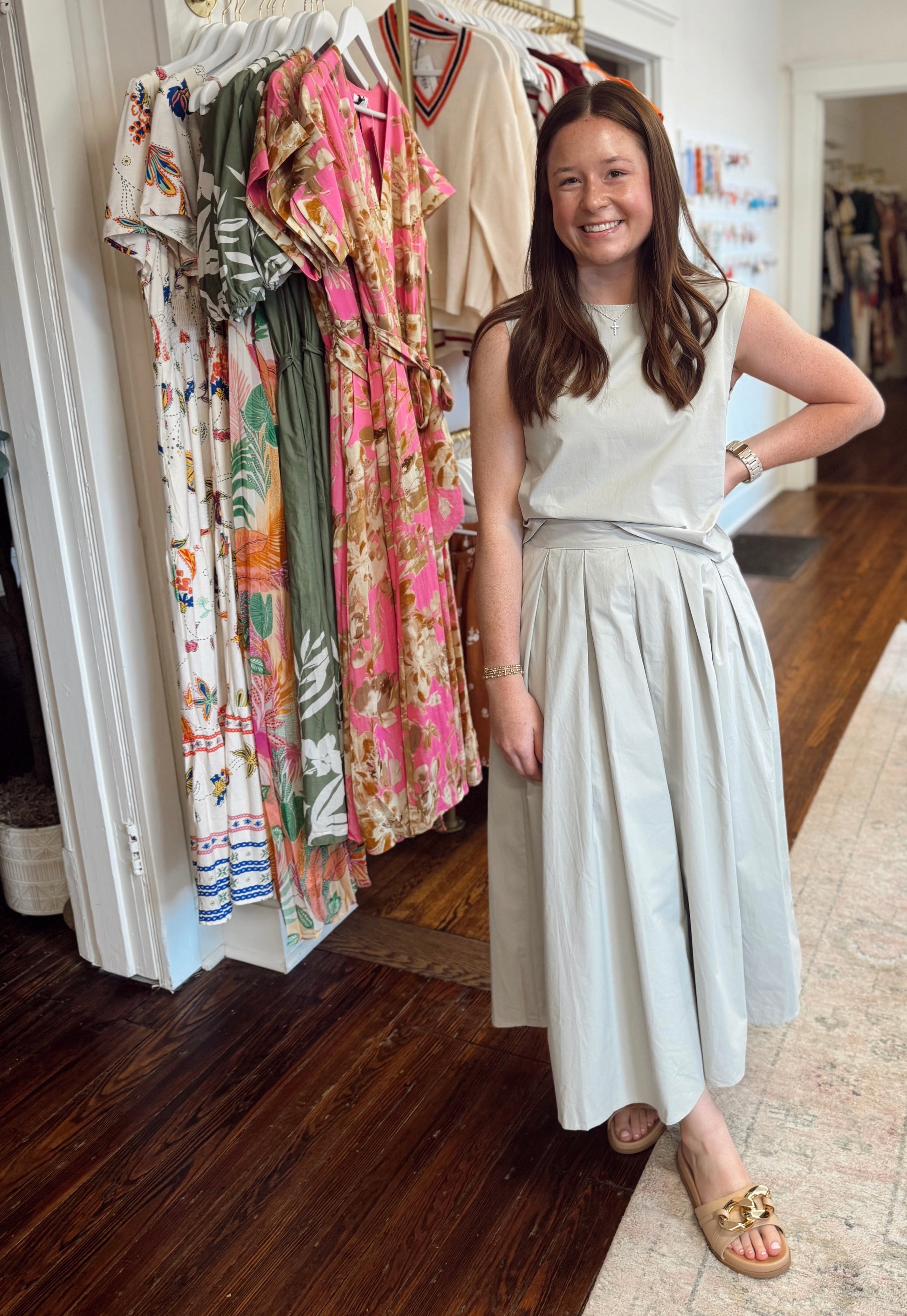 Elevate your wardrobe with the Dusty Mint Pleated Skirt Set, featuring a flowing maxi skirt and a chic sleeveless top. The skirt’s elastic waistband at the back ensures a comfortable, flattering fit all day long. Perfect for warm days or special occasions, this set combines effortless style with ease, making it a versatile addition to your collection. Our model is 5'3" in a small.