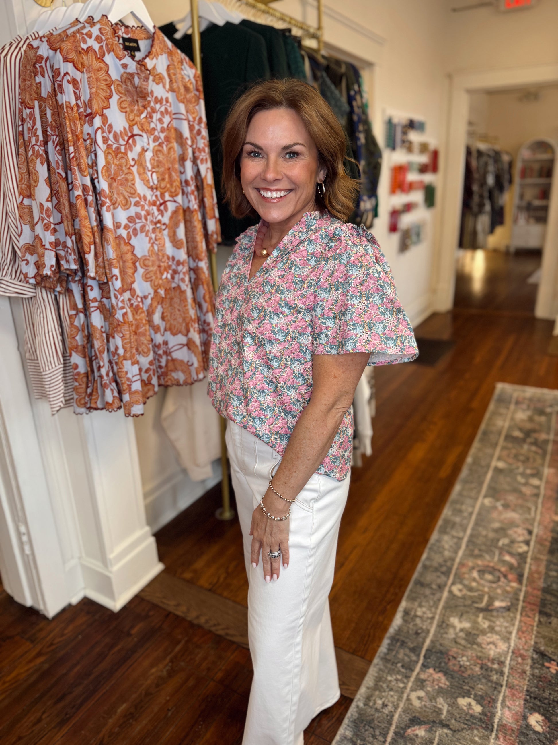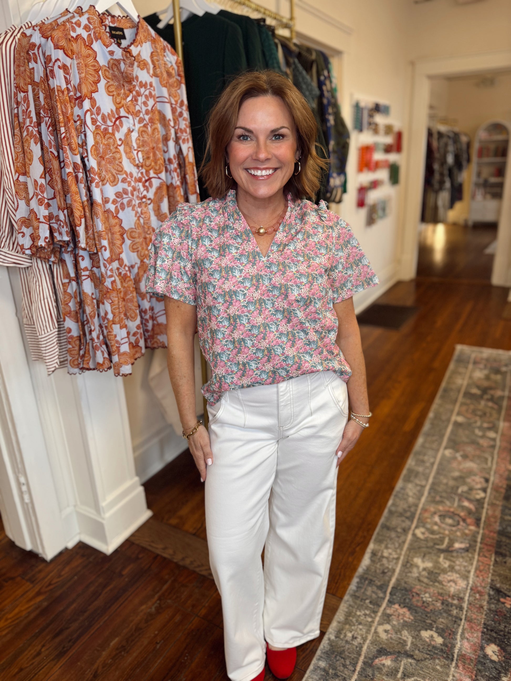 Elevate your warm-weather wardrobe with the Gemalee Eyelet Top, a charming short-sleeve essential that combines delicate femininity with everyday versatility. The romantic eyelet floral pattern brings visual interest, while the flattering V-neckline and ruffled collar add dimension and movement. Perfect for layering or wearing solo, this piece transitions effortlessly from casual outings to weekend gatherings. Soft, breathable fabric keeps you comfortable all day long. Stephanie is 5'0" in a small.