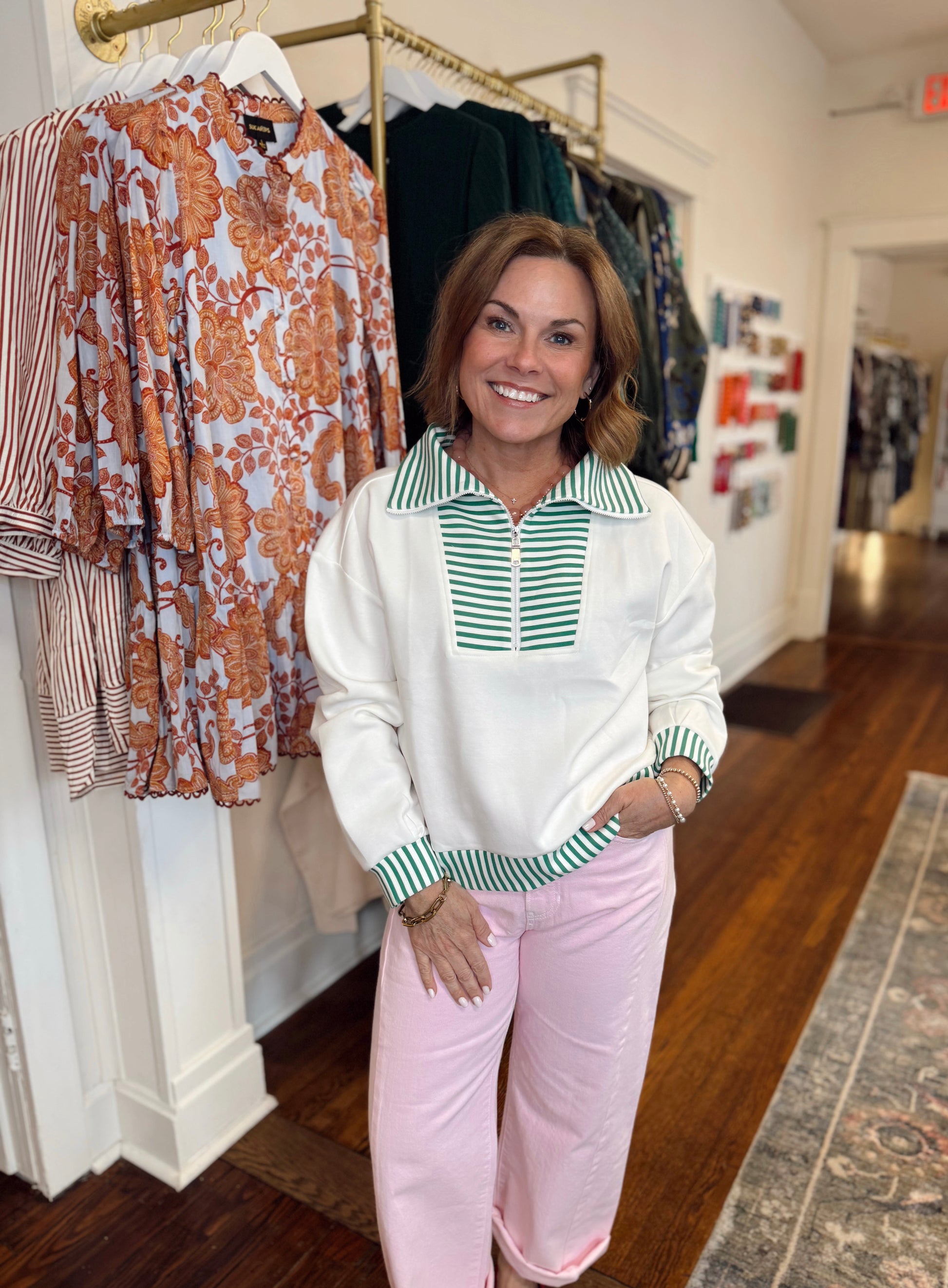 Update your casual wardrobe with the Gia Stripe Quarter Zip, a versatile layering essential that effortlessly transitions from season to season. This lightweight sweatshirt features a crisp white base accented with striking kelly green and white stripes along the sleeves, collar, and hemline—a design detail that adds visual interest without overwhelming your look. The quarter zip construction offers easy adjustability for temperature control, while the relaxed fit ensures all-day comfort. Perfect for layering over basics or wearing solo, this piece brings understated sophistication to your everyday style. Stephanie is 5'0" in a small.