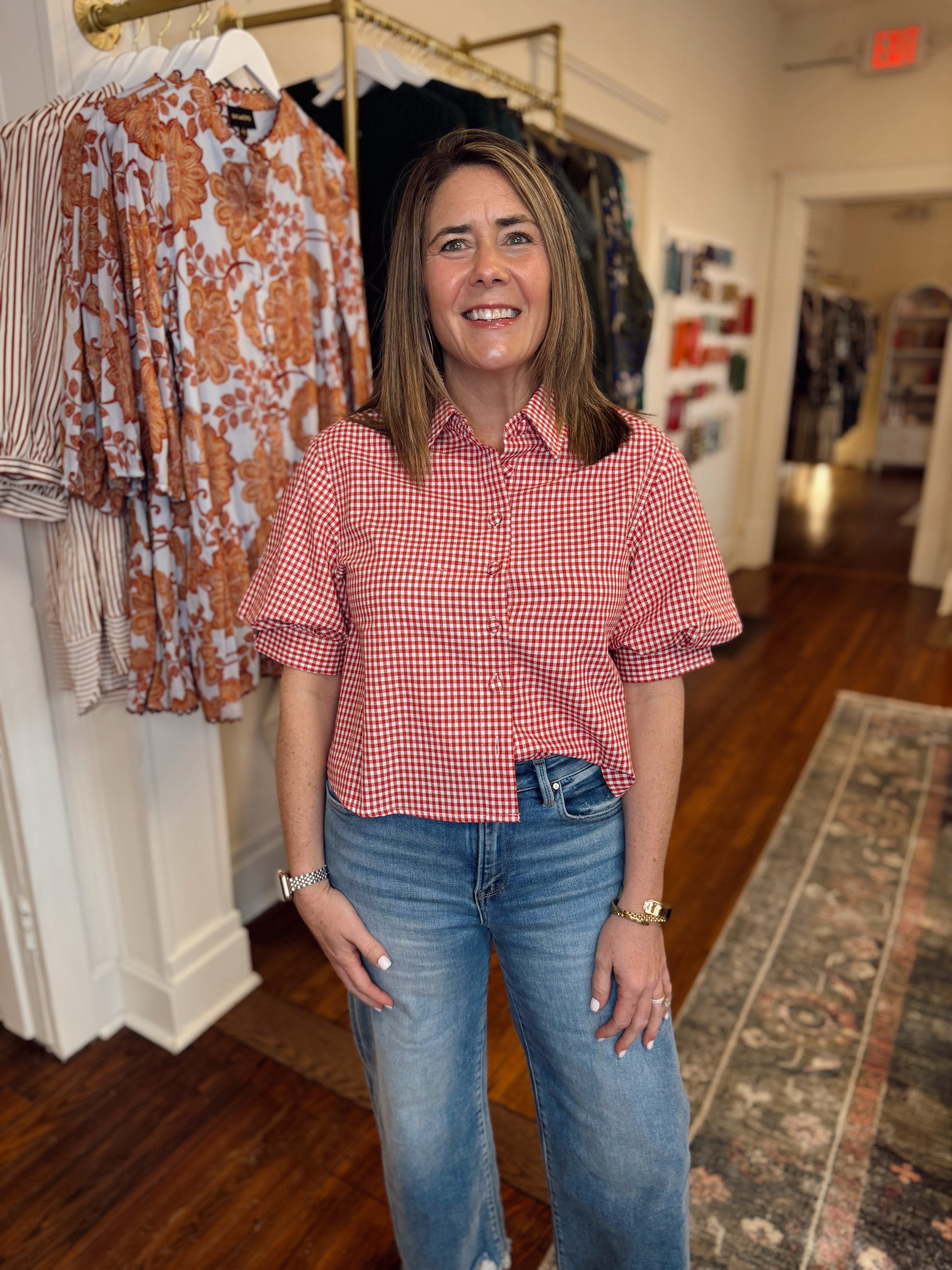 Make a bold impression with the Kelsie Red Gingham Puff Sleeve Top, where vintage-inspired design meets contemporary flair. The striking red and white gingham check creates an eye-catching pattern that commands attention, while dramatic puff sleeves frame the shoulders with undeniable elegance. The button-down front allows you to customize your look—wear it fully buttoned for polished sophistication, partially unbuttoned for relaxed charm, or tied at the waist for a trendy silhouette. Whether you're dressing up for special occasions or elevating everyday wear, this statement piece delivers the confidence and style you deserve. Jaime is 5'3" in a small.