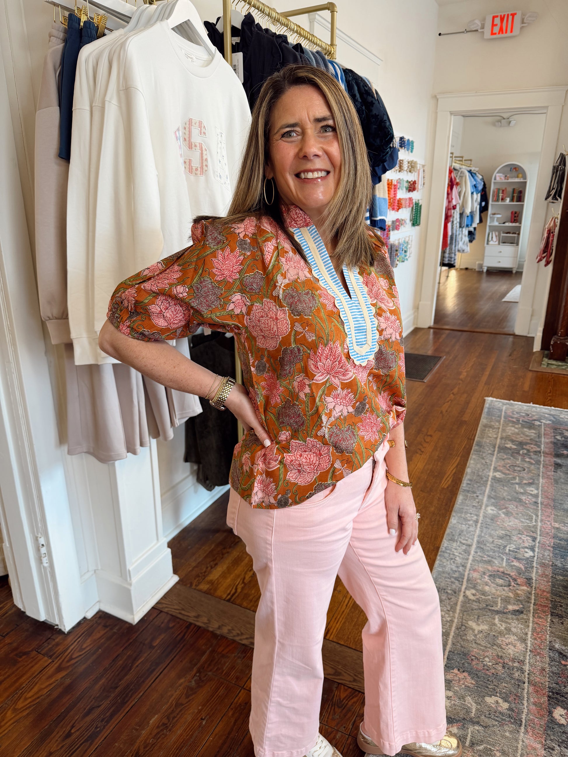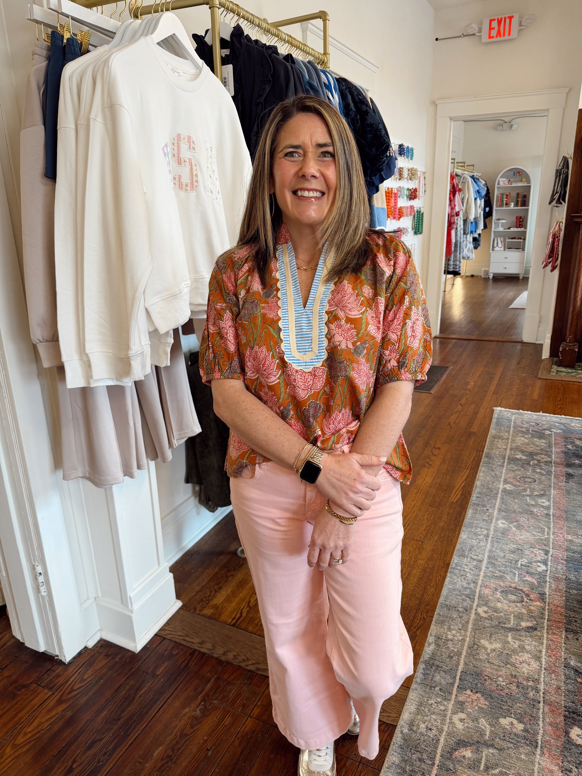The Maren Floral Top is your go-to piece for effortless style with personality. Bursting with warm reds and pinks in an eye-catching floral pattern, this top commands attention while the delicate blue and white scalloped v-neckline adds refined detail. It's the perfect balance of playful and polished—ideal for anyone who refuses to blend in. Pair it with neutrals to let the print shine, or mix and match with your favorite separates for a look that's uniquely you. Jaime is 5'3" in an XS.