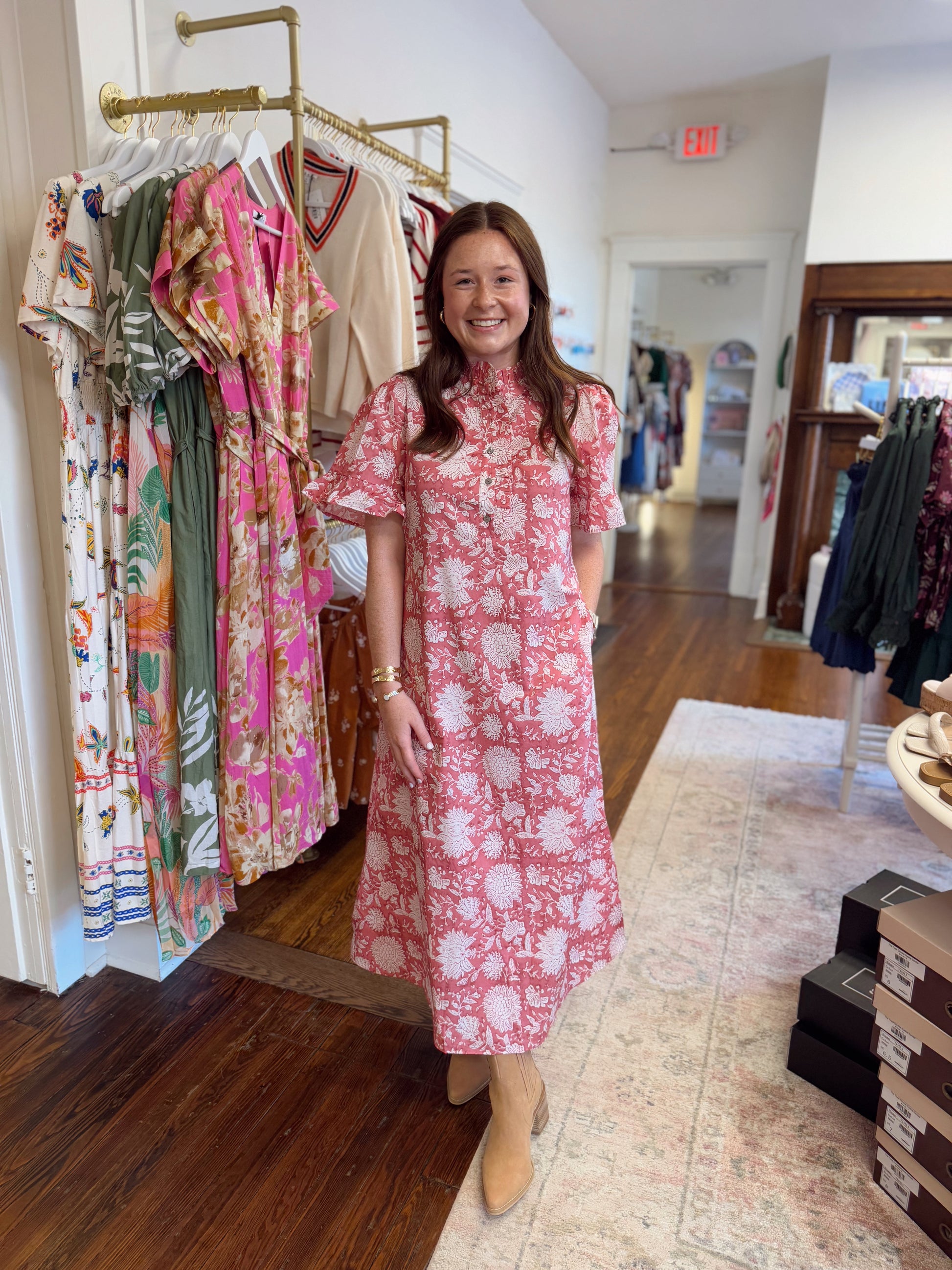 Update your wardrobe with the Marsala Floral Maxi Dress, featuring a rich dark pink hue adorned with delicate white floral patterns. The self-tie belt cinches your waist for a flattering silhouette, while charming ruffles at the collar and cuffs add a touch of feminine elegance. Perfect for any occasion, this dress combines comfort and style effortlessly. Our model is 5'3" in a small.