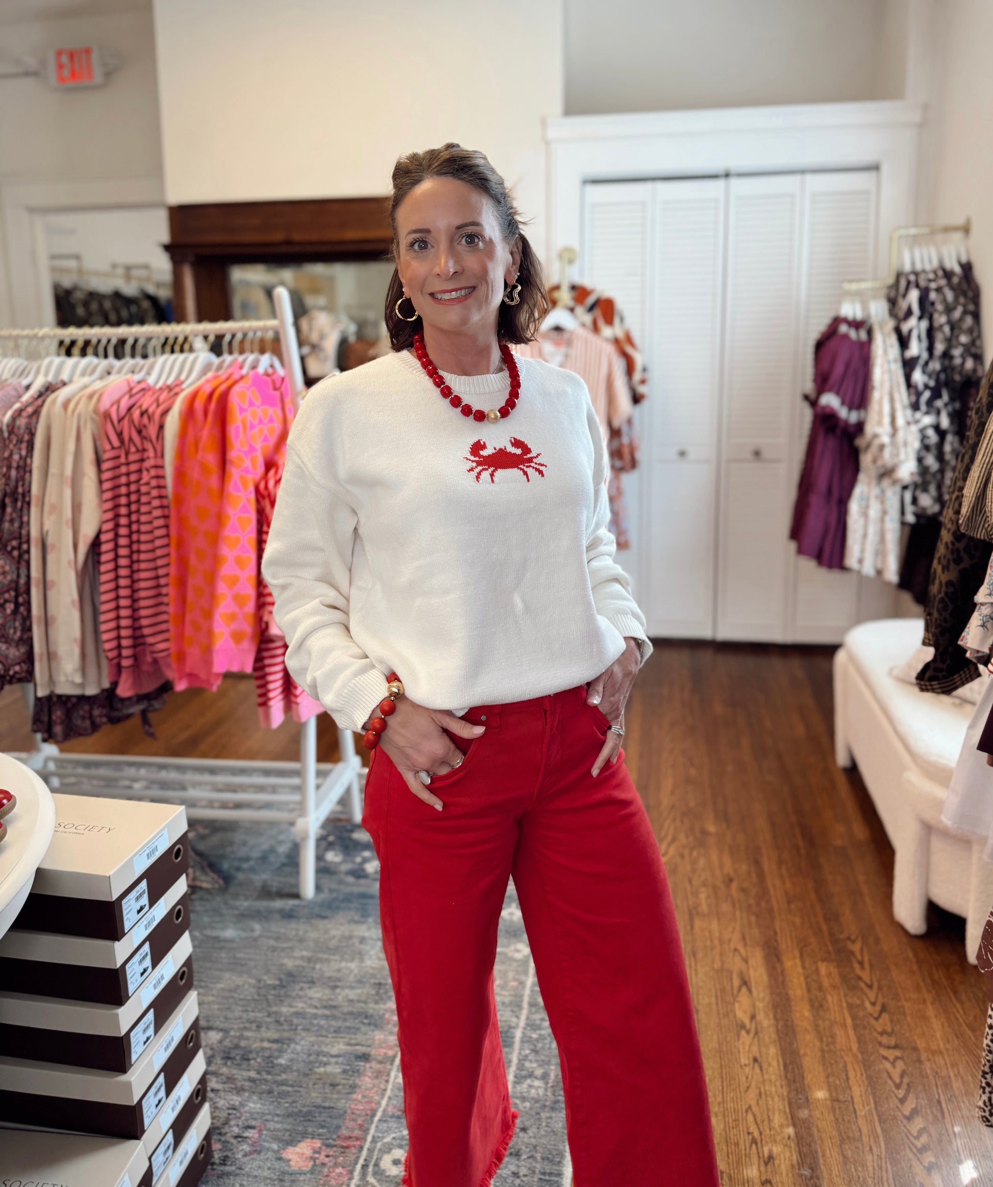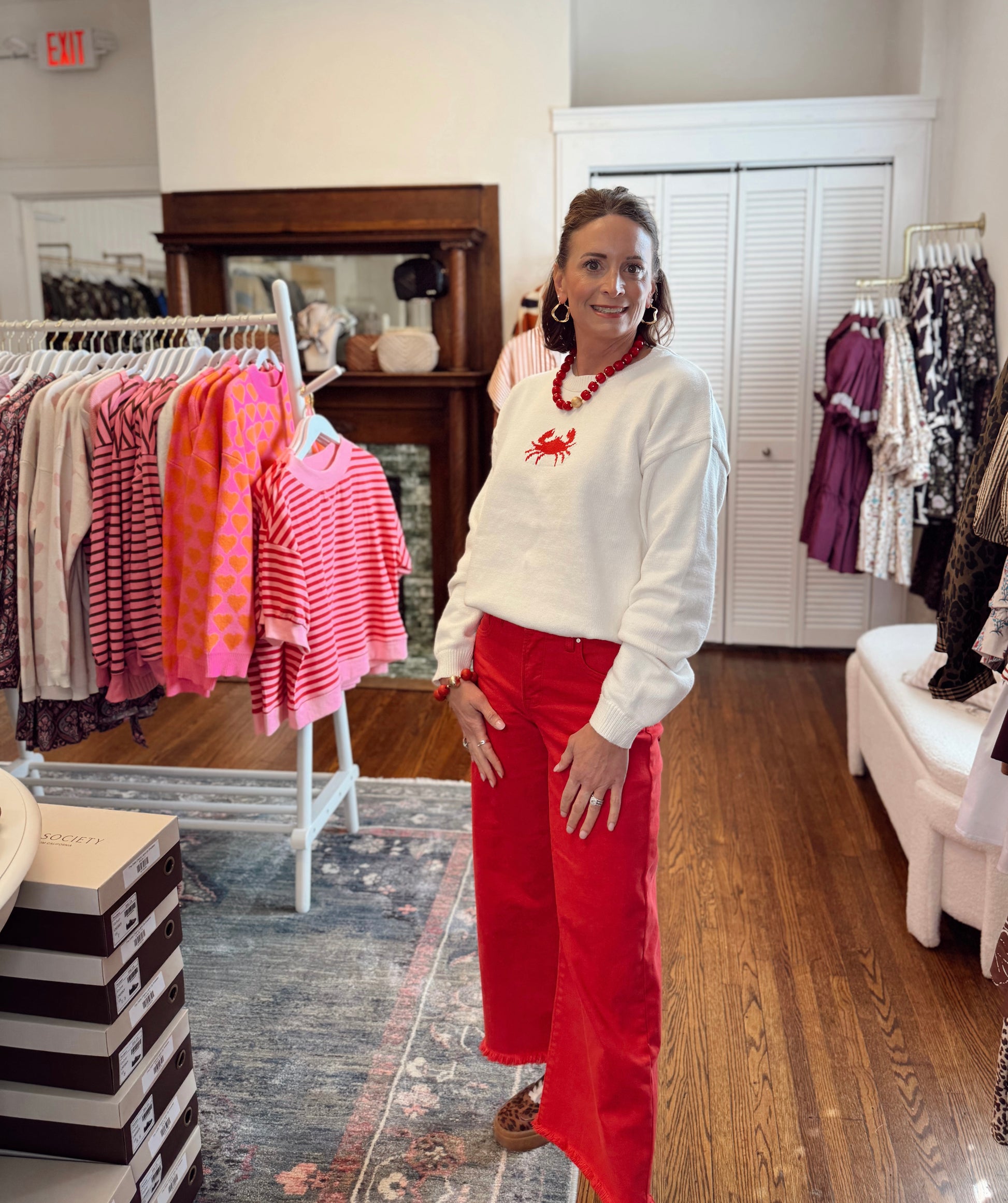 Embrace coastal charm with this delightful Maryland Crab Sweater, featuring an adorable red crab design set against a classic ivory backdrop. Perfect for seafood lovers and beach enthusiasts, this cozy knit combines playful style with everyday comfort. The eye-catching crab motif adds personality to your wardrobe while the neutral ivory tone keeps it versatile enough to pair with virtually any outfit. Whether you're channeling your love for the Chesapeake Bay or simply want a conversation-starting piece, this sweater delivers warmth, character, and undeniable charm. A must-have for anyone who celebrates coastal living with a touch of whimsy. Allison is 5'5" in a small.
