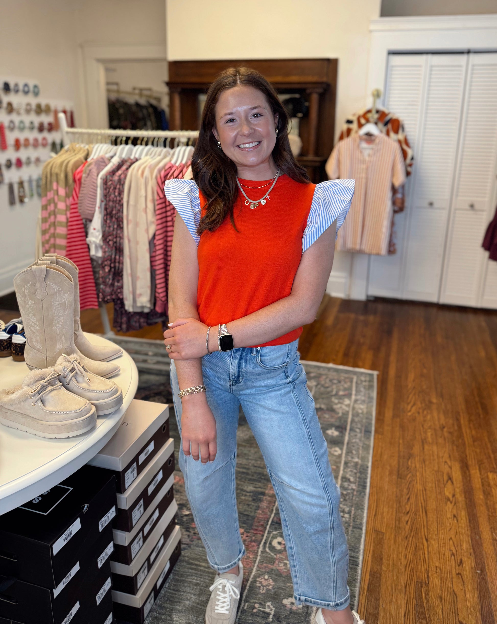 Elevate your everyday wardrobe with the Penelope Flutter Sleeve Top, a vibrant bright orange lightweight sweater that combines comfort with eye-catching style. The delicate light blue and white striped flutter sleeves add a playful, feminine touch that transitions seamlessly from casual days to weekend outings. Crafted from breathable fabric, this piece layers beautifully or stands alone as a statement piece. Perfect for those who refuse to blend in. Taylor is 5'3" in a small.