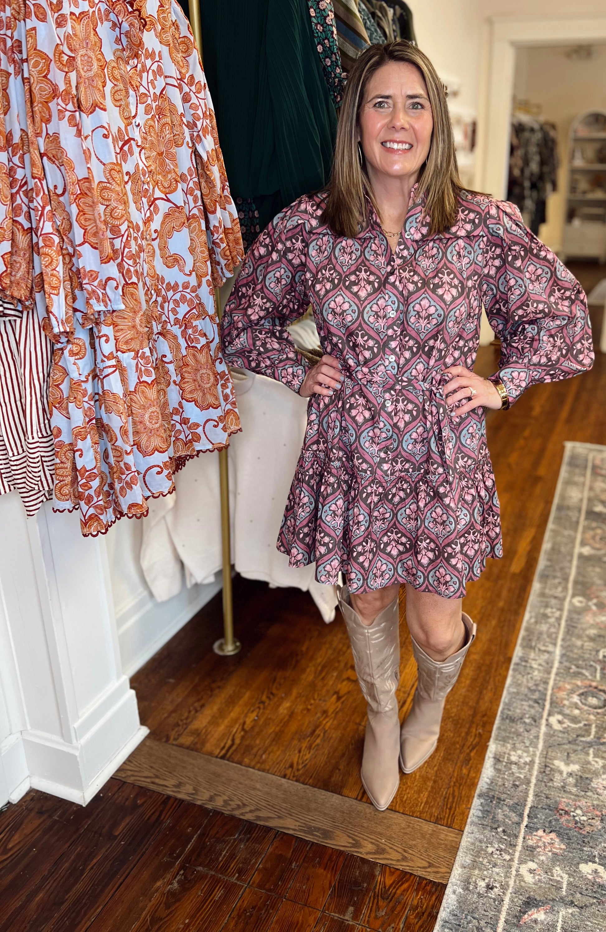 Elevate your wardrobe with this stunning multicolor floral dress that effortlessly transitions from day to night. The vibrant plum-based palette brings sophistication to any occasion, while the adjustable tie waist lets you customize the fit for a flattering silhouette. Delicate ruffles at the hem add movement and playful charm, creating dimension with every step. Perfect for those who want to make a bold statement without sacrificing comfort or versatility. Jaime is 5'3" in a small.