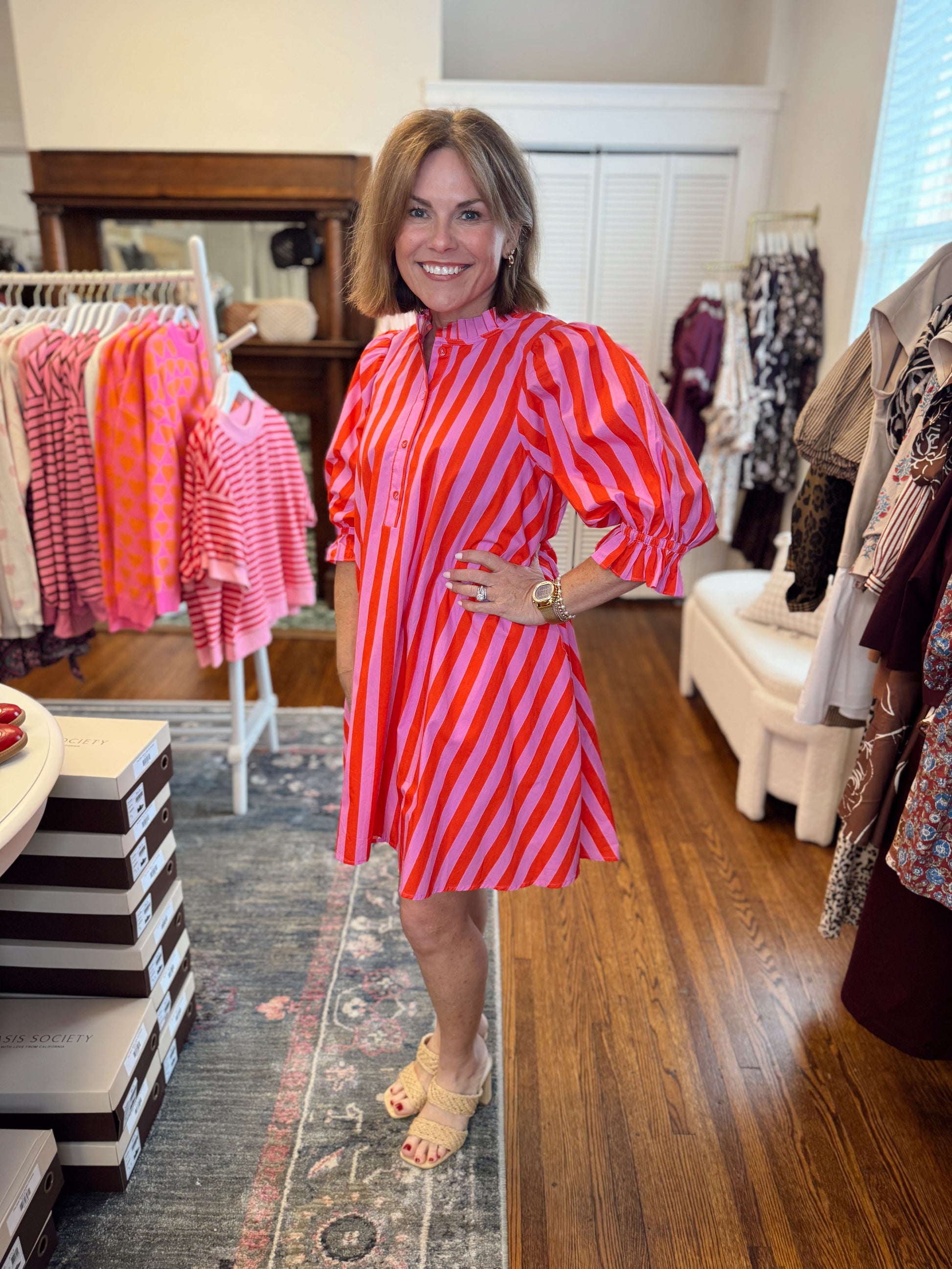 Make a bold statement in this striking vertical stripe dress. The pink and red color-blocked design creates instant visual interest, while elastic puff sleeves add playful dimension and movement. An adjustable tie waist in back lets you customize the fit for a flattering silhouette that works with your body. Perfect for anyone seeking a dress that balances fun, feminine details with modern edge. Stephanie is 5'0" in a small.