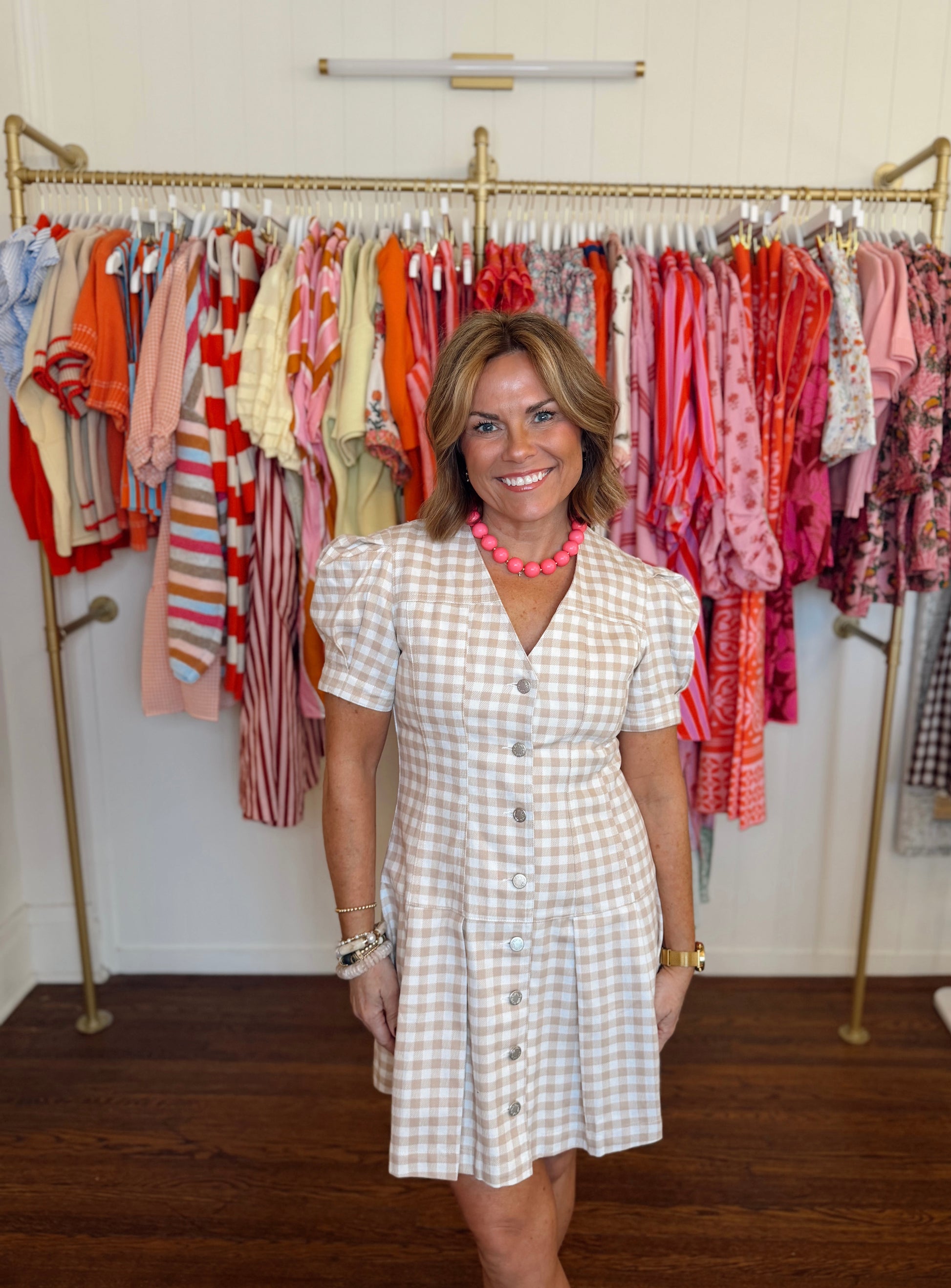 Effortless charm meets timeless style with this khaki and white gingham short sleeve dress. The classic checked pattern brings a fresh, preppy aesthetic perfect for casual outings, weekend brunches, or laid-back summer days. Lightweight and breathable, this piece transitions seamlessly from day to night. The short sleeves offer comfortable coverage while keeping you cool, making it an ideal addition to any wardrobe. Pair it with sneakers for a relaxed vibe or dress it up with accessories for a polished look. Stephanie is 5’0” and in a small.