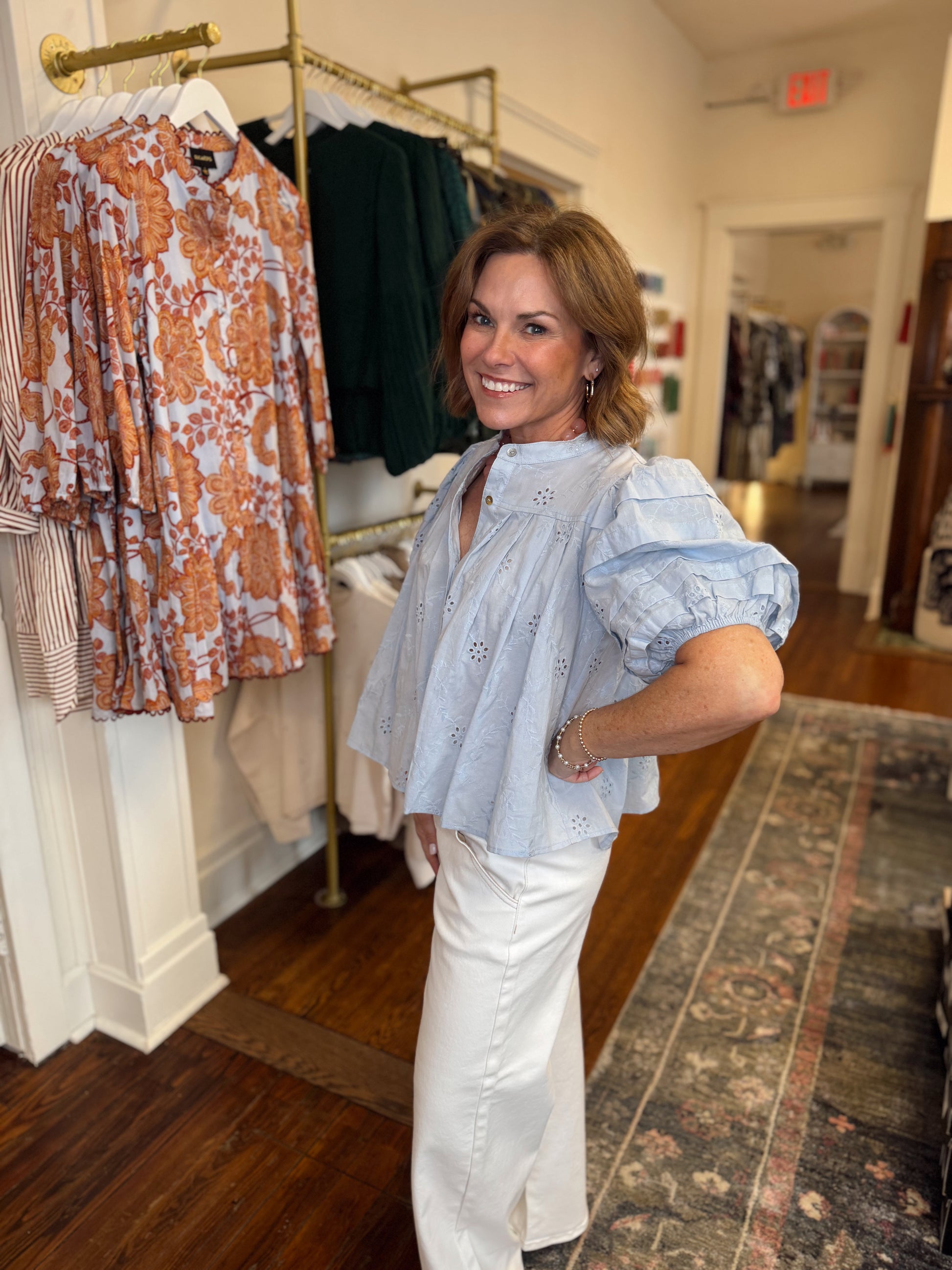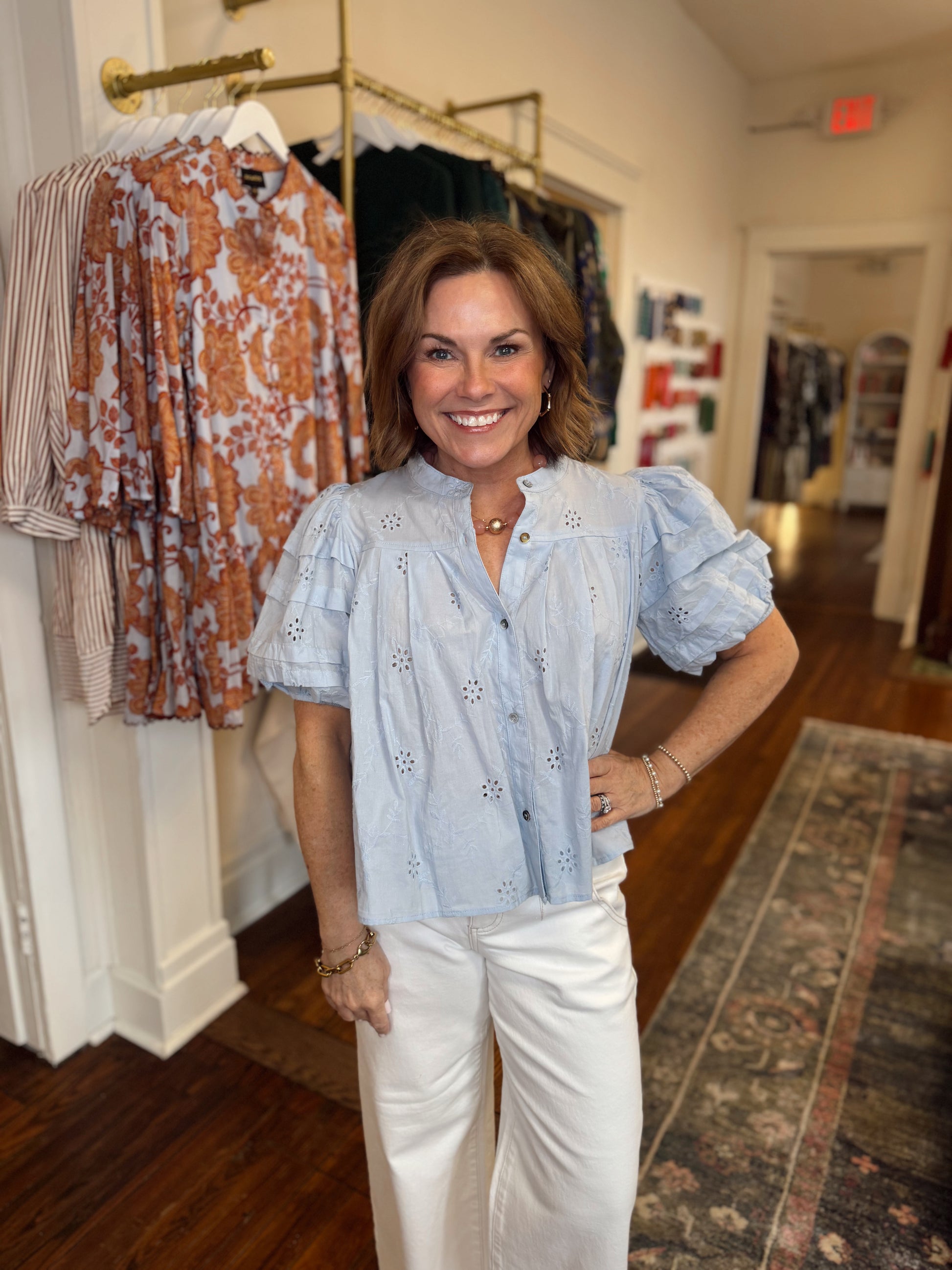 Elevate your everyday wardrobe with the Tilly Bubble Shirt in sky blue—a versatile piece that effortlessly transitions from office to weekend. Featuring romantic puff sleeves and delicate eyelet detailing, this button-down top combines timeless elegance with modern comfort. The flattering V-neckline creates a refined silhouette while the soft, breathable fabric keeps you cool and confident all day long. Perfect for layering or wearing solo, this statement piece adds polish to any outfit. Stephanie is 5'0" in a small.