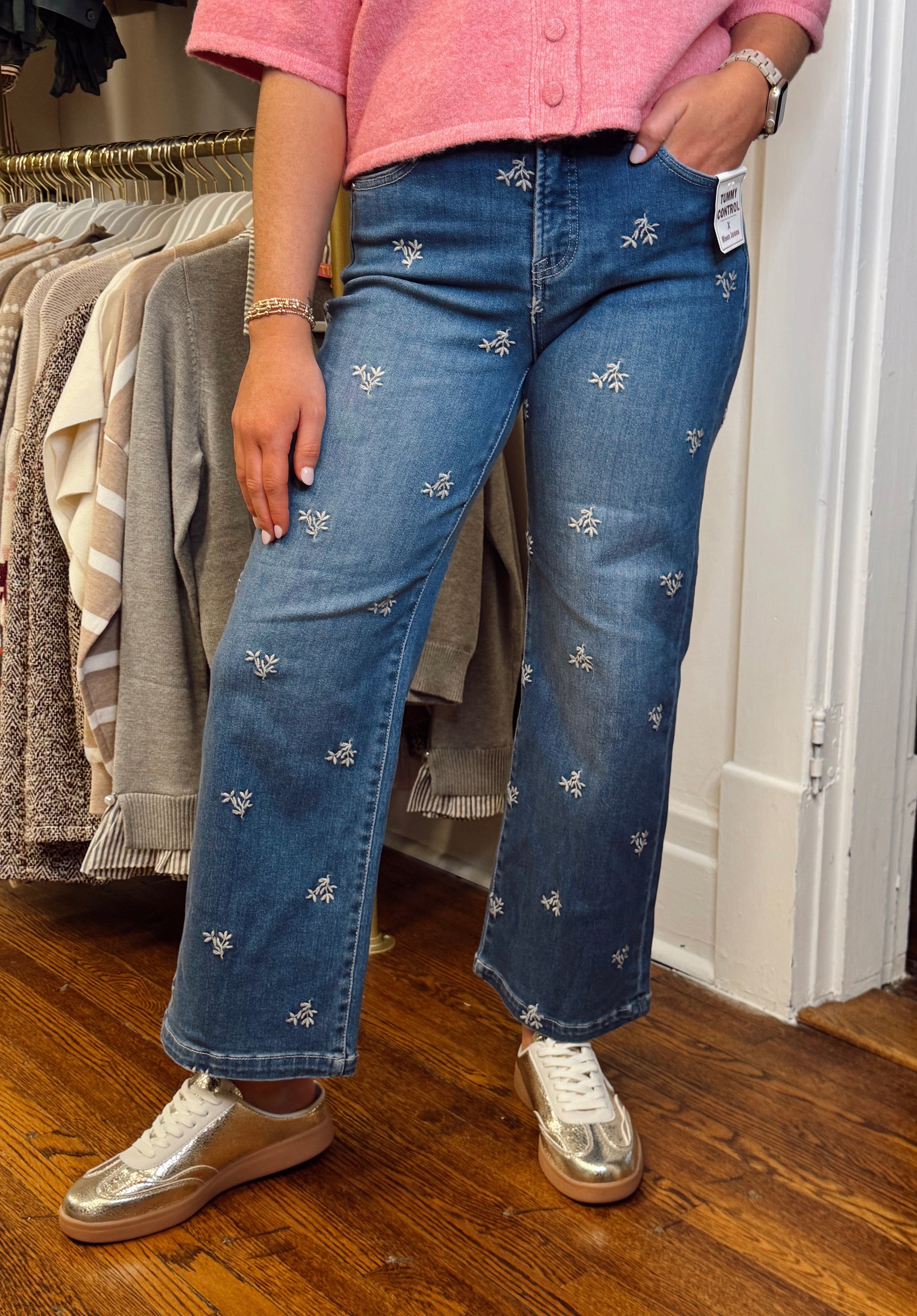 Sculpt your silhouette with these medium wash jeans featuring built-in tummy control that smooths and flatters your figure. Delicate white floral embroidery adorns the design, adding an elegant touch that transitions effortlessly from casual to dressed-up occasions. The supportive waistband keeps everything in place while the classic denim wash pairs with virtually any top in your wardrobe. Comfort meets style—the perfect everyday jean that makes you feel confident and put-together. Taylor is 5'3" in a size 25.