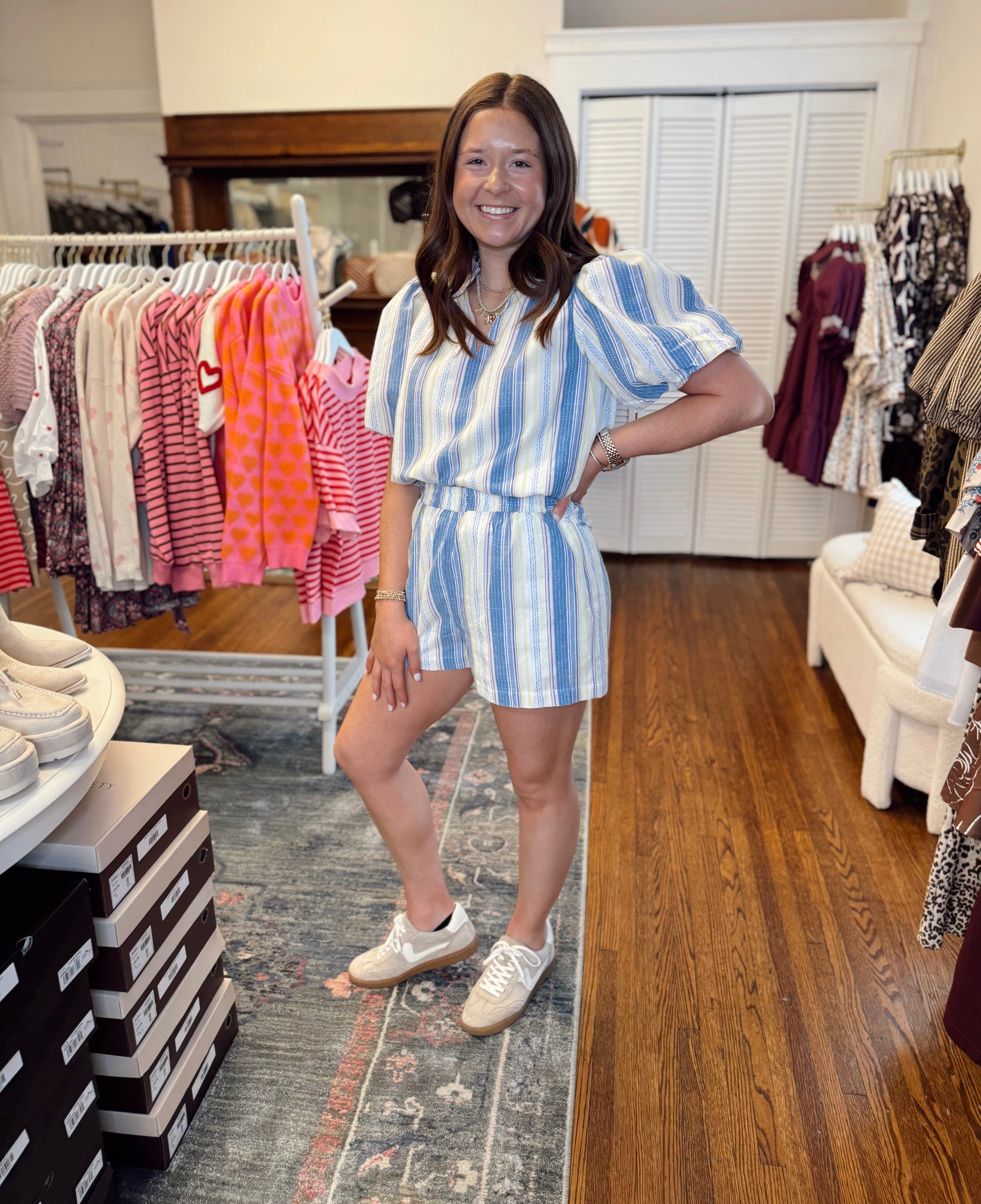 Elevate your warm-weather wardrobe with these vibrant striped shorts featuring a comfortable elastic waist. The bold blue, yellow, pink, and white stripe pattern makes a confident style statement while the relaxed fit keeps you comfortable all day long. Perfect for casual outings, beach trips, or laid-back weekends. Pair with the matching top (sold separately) to complete your coordinated look. A versatile essential that transitions effortlessly from day to night. Taylor is 5'3" in a small.